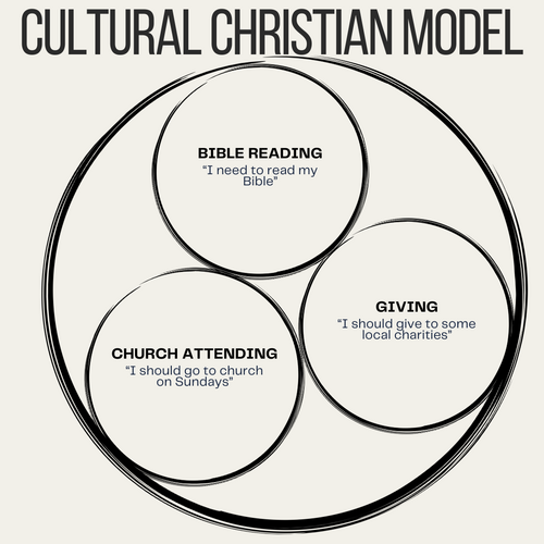 This graphic is a common understanding of the christian life in our area. It separates the basic principles of Christianity into 3 buckets of Bible reading, church attending, and giving. And these actions are motivated out of a moral uprightness that is built into the general fabric of our society and culture.